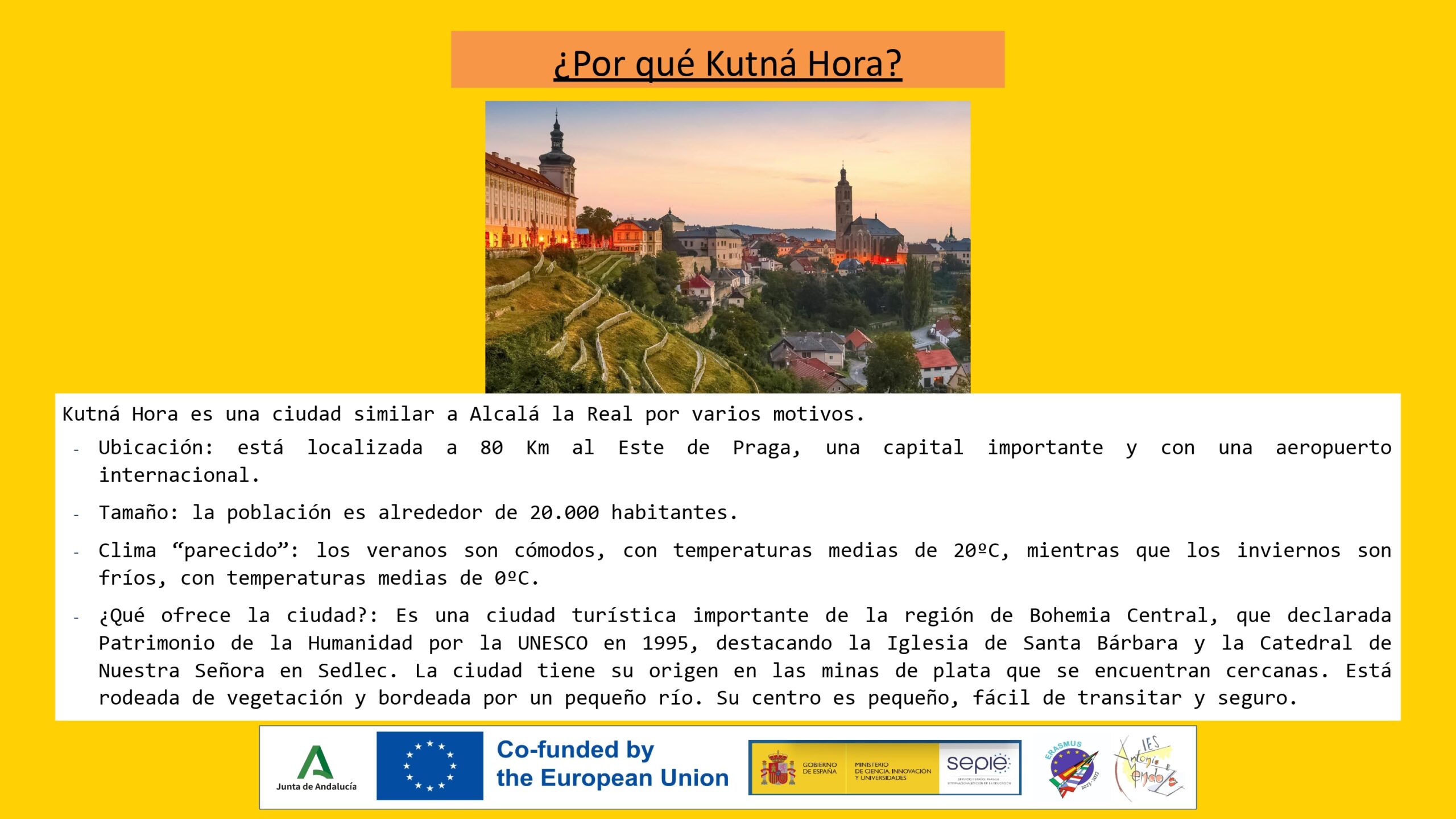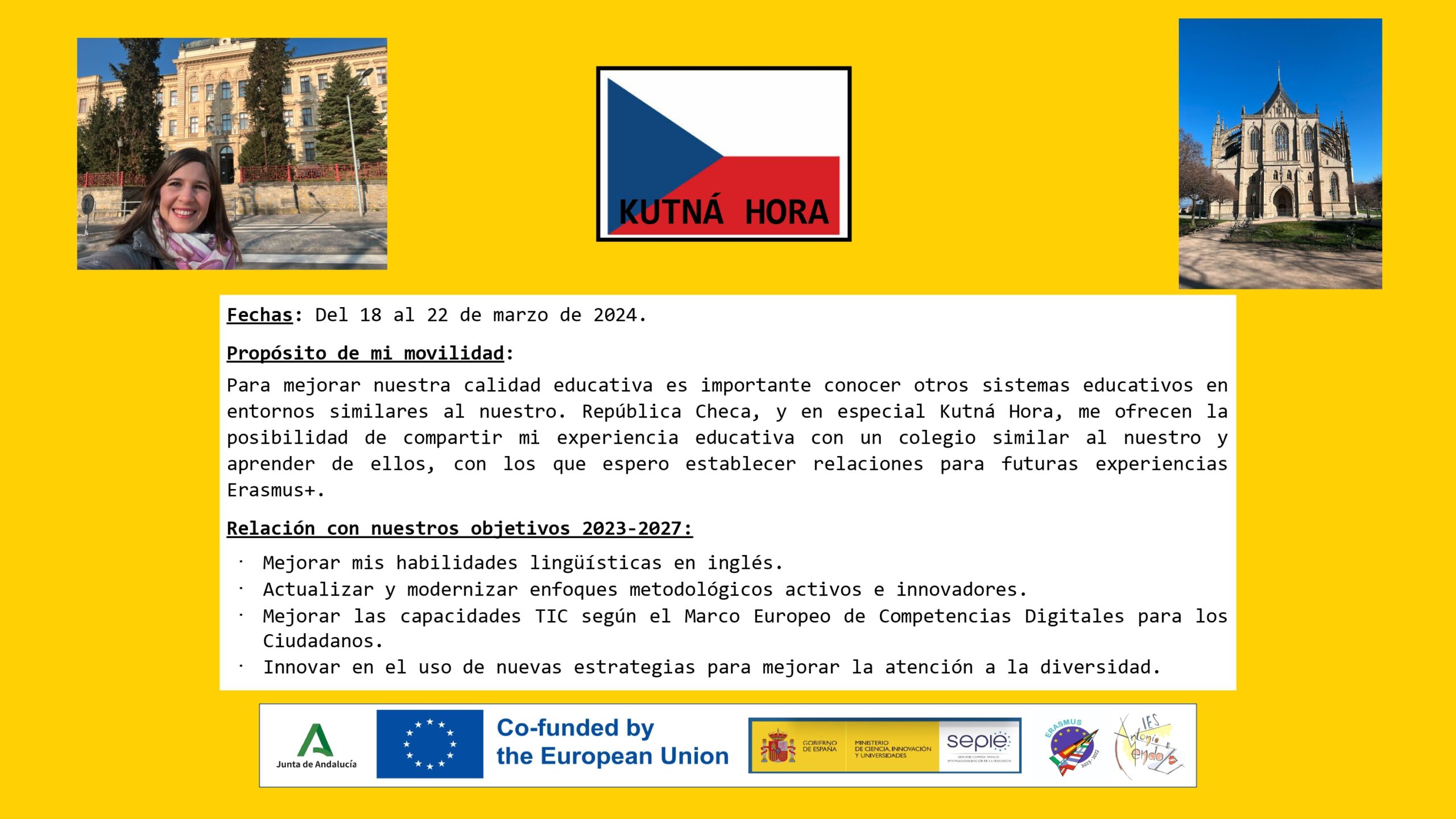 Mª Patricia Pérez López realizó su movilidad en la República Checa, específicamente en la preciosa ciudad de Kutná Hora. En su visita, Patricia actualizó y observó nuevos enfoques metodológicos, observó las clases de idiomas y el uso de la nuevas tecnologías y compartió estrategias para mejorar la atención a la diversidad.