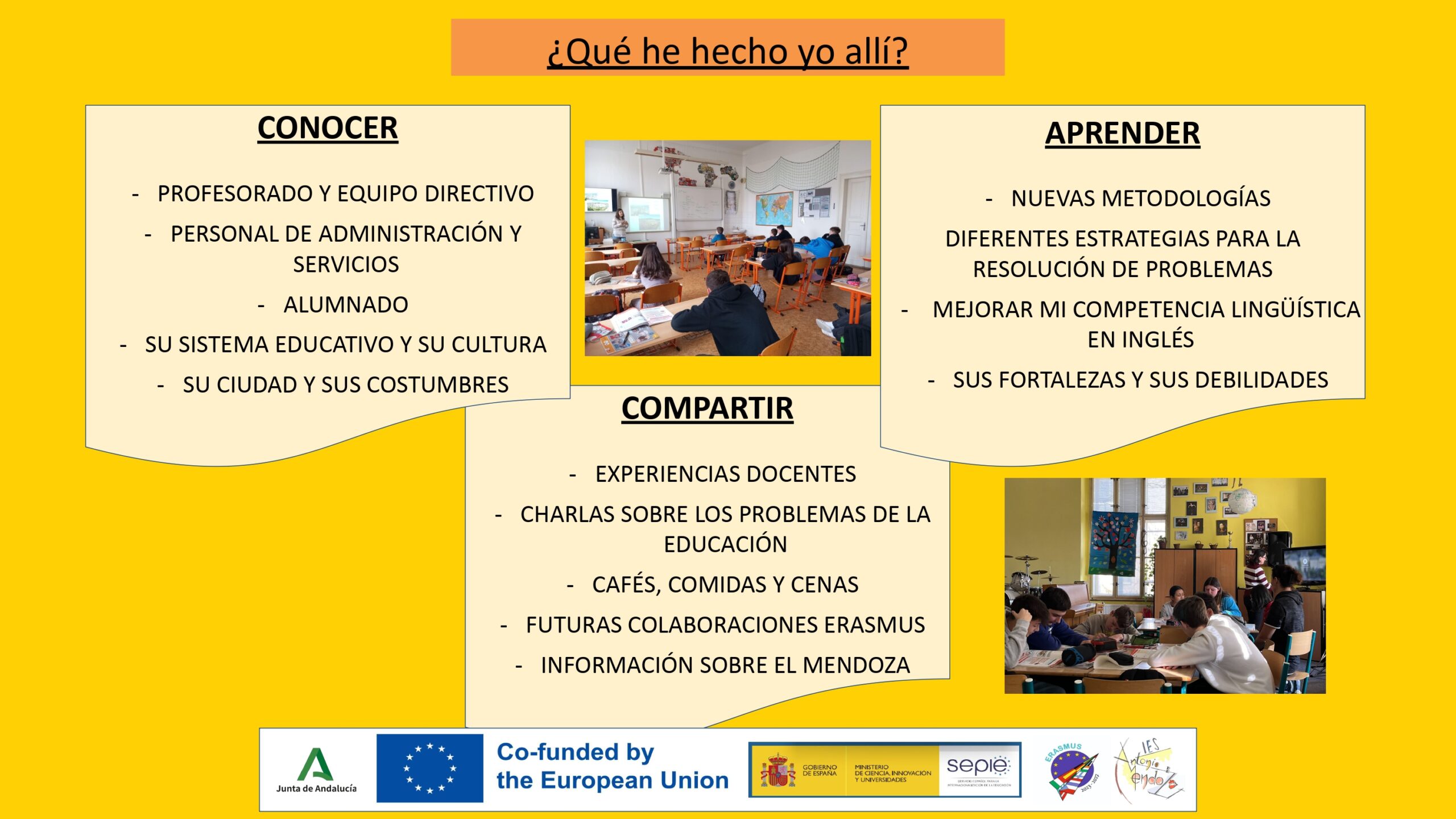 Estas experiencias de job shadowing han sido increíblemente enriquecedoras y ofrecen una valiosa perspectiva sobre diferentes enfoques educativos que podemos observar, adaptar, modificar y/o aplicar en nuestro propio contexto. Durante el claustro del 27 de junio de 2024 en el IES Antonio de Mendoza, nuestros docentes compartieron sus aprendizajes y propuestas con todo el equipo educativo, abriendo un espacio para la reflexión y el diálogo sobre cómo podemos mejorar y evolucionar nuestra práctica pedagógica.