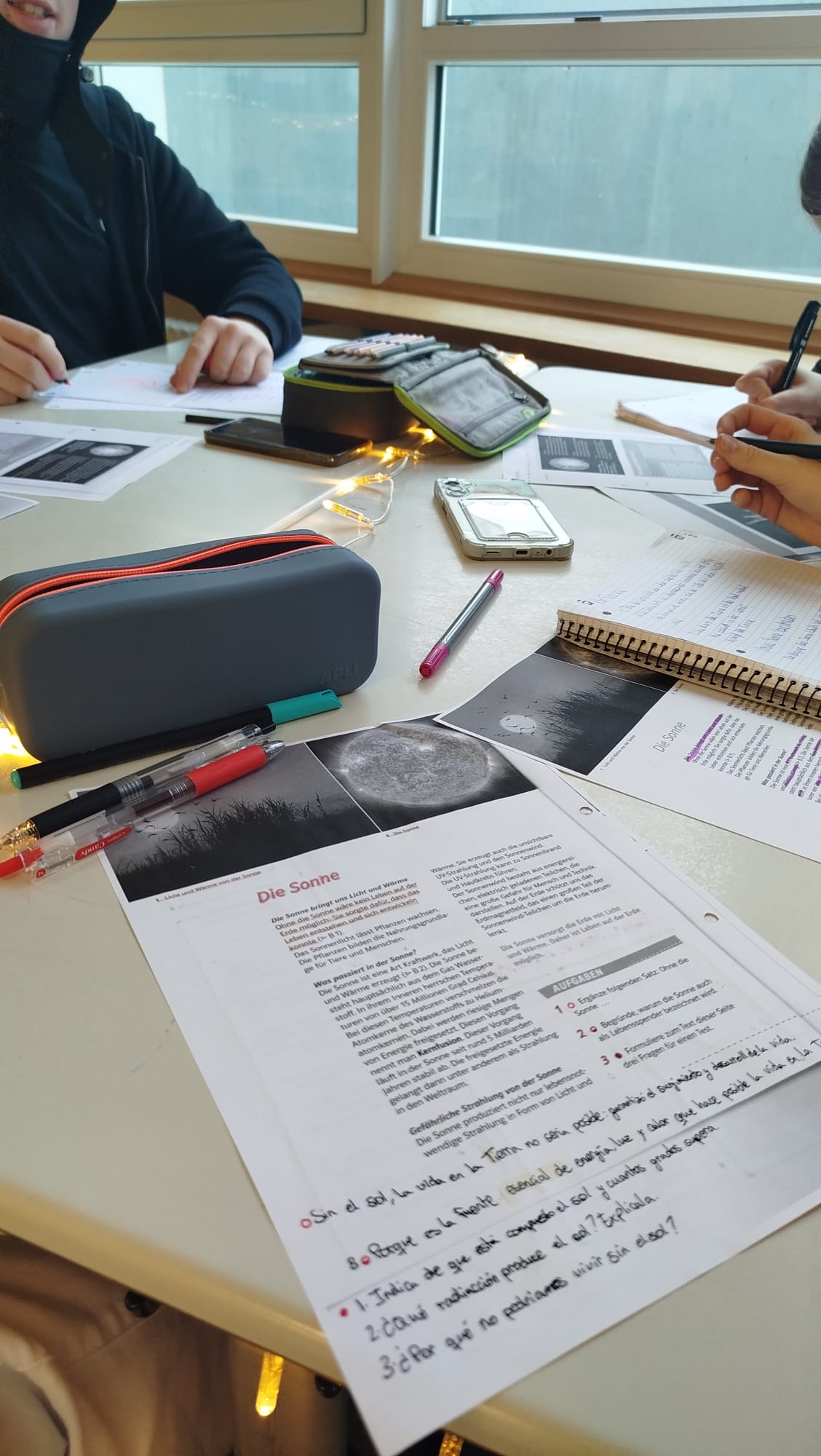 At school, Andrea and Paula have been actively involved in classes, including biology lessons where they worked with images and visual materials, and they are currently preparing a podcast, developing both language and communication skills.